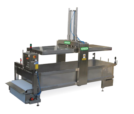 Předlisování s odkapávacím dopravním pásem na spodní straně profilovaného stolu, lisovací deskou, která současně lisuje celou sýrovou hmotu, a řezacími noži v přední části nádoby ...